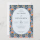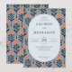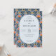 Este convite de casamento apresenta um design vibrante e divertido com uma moldura oval no centro, rodeada por um padrão floral simétrico. A paleta de cores inclui tons alegres de rosa coral, laranja e azul-marinho profundo sobre um fundo azul claro, criando uma atmosfera alegre e convidativa. A técnica artística é ilustração digital, caracterizada por linhas limpas e cores planas, dando-lhe um visual moderno e retrô. A tipografia serifada elegante destaca o texto principal, garantindo clareza e formalidade, enquanto os motivos de flores estilizadas adicionam profundidade e interesse visual. Perfeito para celebrar uma ocasião festiva, este design atinge um equilíbrio entre elegância e capricho.