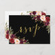 Chic vintage borgonha floral aquarela e letra manuscrita em falso dourado com cartão de resposta de casamento com fundo preto. Elke Clarke © Preto na frente e branco no verso para que seus convidados possam facilmente escrever seus nomes e suas informações. Outras cores disponíveis em www.zazzle.com/monogramgallery. Um simples, mas versátil, script manuscrito rsvp para casamentos ou outras ocasiões especiais, como jantares de ensaio, presentes para os noivos, celebrações de aniversário de casamento. O dourado é um efeito de foto impressa.
