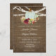 Convite de Casamento Rústico em Madeira com Brilho e Abóbora Azul Bordô Floral. Madeira de celeiro escura e rica, desgastada pelo tempo, com luzes cintilantes ao fundo, destaca as flores bordô e rosa com uma abóbora azul para um toque moderno. A arte foi pintada à mão em aquarela por Audrey Jeanne Roberts. Conjunto completo disponível para coordenar. Direitos autorais.