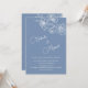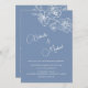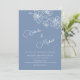 Desenho minimalista com esboço floral branco de flores de cerejeira e em um fundo azul poeirento. Convite de casamento botânico moderno desenhado à mão com os nomes dos noivos em uma fonte caligráfica elegante. Com sua foto no verso.