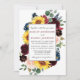 A moderna Elegante Watercolor Burgundy Marsala Convite Floral para Casamento de Quadros Florais inclui rosas burguentos, rosas cor-de-rosa, flores vermelhas, flores azuis, girassóis, folhas de eucalipto e verde botânico.
