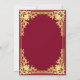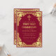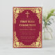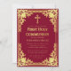 Este convite de primeira comunhão elegante em burgundy dourado com um ar vintage, recomendado para uma menina, tem uma moldura ornamentada em folha de ouro falso com decorações douradas barrocas elegantes em fundo burgundy. Acima do texto há uma cruz religiosa em folha de ouro falso. Exceto pela ocasião "Primeira Comunhão", que também está em ouro falso, todo o texto pode ser personalizado e tem uma cor amarelo-dourado semelhante à moldura de ouro falso.
