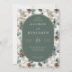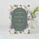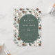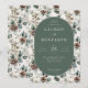Este convite de casamento elegante apresenta um design inspirado no vintage com um painel central em forma oval colocado contra um fundo verde suave, rodeado por uma bordadura floral e botânica de folhas, bagas e pinhas em tons de bege suave, verde-oliva e marrom terroso. O layout é simétrico, criando uma composição equilibrada e harmoniosa que emana calor e sofisticação. A tipografia serifada elegante destaca os nomes e detalhes do evento, enquanto o estilo geral combina impressões botânicas clássicas com charme rústico, tornando-o perfeito para uma reunião íntima e sofisticada. A técnica de ilustração digital limpa e polida realça o sentimento natural e orgânico, ideal para celebrar um momento especial da vida com graça e refinamento.