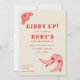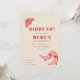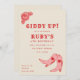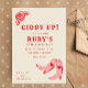 Convites de aniversário com texto decorativo rosa e vermelho "Giddy Up", ilustração de rosa e botas de cowgirl rosa com corações. O fundo é branco esbranquiçado.