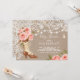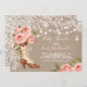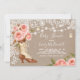 O convite elegante de serapilheira & de laço que caracteriza uma bota bonito da vaqueira decorada com um buquê de cora rosa/rosas do pêssego