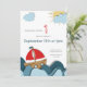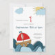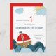 Adorável convite de primeiro aniversário com uma ilustração de um barco com velas vermelhas no mar ondulado. A ilustração parece que tem formas de papel coladas formando uma ilustração tridimensional mas é apenas um impressão. Ilustrada e projetada por Patricia Alvarez.