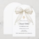 An arch shaped Confirmation invitation. A white background, decorated with a large ivory colored bow with pearls and a golden cross. Personalize and add a name and details details.