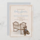 Esta design apresenta um convite clássico de vintage, de um bebê azul, com um ursinho clássico, azul-ursinho, ursinho de pelúcia, uma tipografia elegante com script de caligrafia, código QR para o Facebook ou site de mídia social e página de eventos online com um convite tradicional clássico de tendências, um beliche de berço de vintage, um bege azul-castanho, um estilo simples e antiquado, para um convite a chá de um menino, para um trabalho de arte desenhado à mão por um rapaz ou uma menina por Laura Lacina.