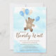 This charming baby boy's baby shower invitation features a cute watercolor teddy bear, blue balloons, and sky. It says We Can Bearly Wait in stylish script typography. It is easily customizable. Original Watercolor © Michele Davies.