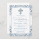 Meninos, batismo azul, convite com bela cruz de diamante azul e roteiro elegante em um bonito fundo azul e rolo branco. Este elegante convite para batismo azul é facilmente personalizado para o seu evento simplesmente adicionando os seus detalhes no estilo de letra e cor, e o texto da sua escolha.