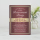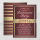 Quer amigos e familiares estejam praticando distanciamento social ou simplesmente vivam longe, conectem-se com eles online com um na moda virtual de aposentadoria! Todo o texto neste modelo é simples de personalizar para um drive-by/drive através de desfile de carro ou evento de videoconferência de zoom com bate-papo na Internet. Também é possível incluir uma mensagem pessoal, se necessário, devido a um cancelamento ou adiamento. O design de burgundy, branco e ouro apresenta um fundo ombre moderno, borda falsa e listras, caligrafia elegante com script e deco de arte vintage inspirado na tipografia. Observe que o vermelho de marrom e o ouro são impressos em cores, e não em folhas metálicas. Este modelo de convite está preparado para uma aposentadoria, mas também pode ser para uma festa de despedida.