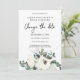 As coisas mudam. Envie este cartão de alteração de data para mudar a data e, se necessário, o endereço e a hora do seu casamento ou evento. Decorado com flores brancas e azul poeira. Fundo branco.