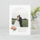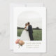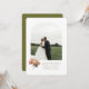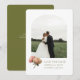 Moderno e chique. Este maravilhoso casamento, salvar o cartão de data, apresenta uma bela buquê de rosas volutuosos contra fundos brancos e verdes de azeitona. O design inclui uma foto de casal no quadro de arco de inicialização, conjunto contemporâneo de fontes em verde-oliva na frente e texto opcional adicional no verso.