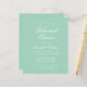 Um simples convite para jantar de ensaios. Tem apenas texto branco em fundo verde menta. As palavras "Jantar de Ensaios" e o nome estão escritos em uma elegante caligrafia.