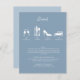 Peonies coordenando o cartão de detalhes pintado e detalhado. Jardim, botânico, impressão da natureza. Cartão com óculos de vinho tostando, prato de janto, calçado para dança e carro antiquado para boas noites! fundo azul na cor pantone Baby Blue 13-4308 ou hex b6cada, hex frontside #85A0b6