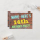 Este design de convite de aniversário divertido apresenta uma mensagem como "NAME-HERE'S 14 FESTA DE ANIVERSÁRIO!", onde o nome pode ser personalizado, na frente. O fundo apresenta uma representação de uma parede de tijolos constituída por alguns tijolos de cor castanha avermelhada. O texto de mensagem personalizável na frente apresenta cores como azul, amarelo e verde, e tem uma aparência inspirada pelo grafite pintado. A parte traseira apresenta uma mensagem personalizável que pode incluir detalhes relevantes sobre a festa de aniversário. Convites de festas de aniversários como esta podem ser uma maneira divertida de convidar a família e os amigos para uma festa de aniversário que está sendo realizada para alguém que está comemorando seu décimo quarto aniversário. [~Z0000287]