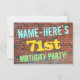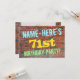 Este design de convite de aniversário divertido apresenta uma mensagem como "NAME-HERE'S 71rua!", onde o nome pode ser personalizado, na frente. O fundo apresenta uma representação de uma parede de tijolos constituída por alguns tijolos de cor castanha avermelhada. O texto de mensagem personalizável na frente apresenta cores como azul, amarelo e verde, e tem uma aparência inspirada pelo grafite pintado. A parte traseira apresenta uma mensagem personalizável que pode incluir detalhes relevantes sobre a festa de aniversário. Convites de festas de aniversários como esta podem ser uma maneira divertida de convidar a família e os amigos para uma festa de aniversário que está sendo realizada para alguém que comemora seus setenta anos de primeiro aniversário. [~Z0000287]
