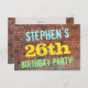 Este design de convite de aniversário divertido apresenta uma mensagem como "A 26ª FESTA DE ANIVERSÁRIO do STEPHEN!", onde o nome pode ser personalizado, na frente. O fundo apresenta uma representação de uma parede de tijolos constituída por alguns tijolos de cor castanha avermelhada. O texto de mensagem personalizável na frente apresenta cores como azul, amarelo e verde, e tem uma aparência inspirada pelo grafite pintado. A parte traseira apresenta uma mensagem personalizável que pode incluir detalhes relevantes sobre a festa de aniversário. Convites de festas de aniversários como esta podem ser uma maneira divertida de convidar a família e os amigos para uma festa de aniversário que está sendo realizada para alguém que está celebrando seus vinte e seis anos. [~Z0000287]