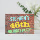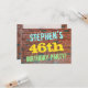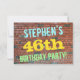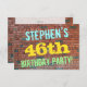 Este design de convite de aniversário divertido apresenta uma mensagem como "A 46ª FESTA DE ANIVERSÁRIO do STEPHEN!", onde o nome pode ser personalizado, na frente. O fundo apresenta uma representação de uma parede de tijolos constituída por alguns tijolos de cor castanha avermelhada. O texto de mensagem personalizável na parte frontal apresenta cores como azul, amarelo e verde, e tem uma aparência inspirada pelo grafite pintado. A parte traseira apresenta uma mensagem personalizável que pode incluir detalhes relevantes sobre a festa de aniversário. Convites de aniversário como esta podem ser uma maneira divertida de convidar a família e os amigos para uma festa de aniversário que está a ser feita para alguém que está a celebrar o seu 46º aniversário. [~Z0000287]