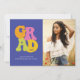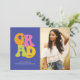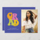 This fun graduation invitation has a modern take on vintage 1970s design. The front of the card includes 70s lettering on the left and a vertical photo on the right. The retro typography reads "Grad" in shades of bright orange, bold pink, summer green, and sunny yellow against a purple background. The graduate's name and school are written below the typography, and the graduation year is written across the D in "Grad". On the back, there is a template for graduation party details.