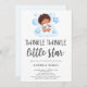 Personalize facilmente este convite de chá de bebê masculino lindamente estilizado. O convite apresenta um adorável bebê sorridente sentado nas nuvens com as palavras "brilha, brilha estrelinha". Procure por itens correspondentes na loja em breve!
