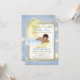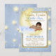 Convite de chá de bebê Meninos Brilham, brilham, estrelinhas com adorável menino étnico em uma linda lua amarela com nuvens macias segurando uma estrela amarela brilhante em um lindo fundo estrelado azul e amarelo com folha dourada. Você pode personalizar facilmente este lindo convite de chá de bebê brilham, brilham, estrelinhas para o seu evento simplesmente adicionando seus detalhes no estilo de letra de sua escolha. Este é um design impresso sem folha, glitter, etc. reais.