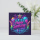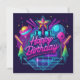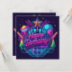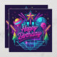Este design consiste em um fundo iluminado por neon com destaques que brilham no escuro e tipografia "Feliz Aniversário".