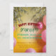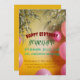Fundo amarelo vibrante que varia do claro ao escuro, rodeado por um arranjo exuberante de ramos verdes com folhas delicadas e desbotadas que parecem murchar suavemente, e decorado com uma variedade de balões rosa brilhante de diferentes tamanhos criando uma sensação de fantasia e celebração.