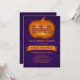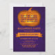 Convidado de aniversário de Halloween divertido e divertido. Púrpura escura e laranja. Grande jack-o-lanterno com olhos brilhantes e boca e uma saudação escrita sobre ela. Ideal para a festa de festas de Dia das Bruxas.