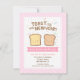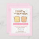 Convide seus amigos para comemorações de Ano Novo com este design de convite divertido! O manual casual, como o texto, diz: "Toast to the New Year!" Em vez de champanhe e levantar seus óculos, que tal torradas de pão sorridente com confete colorido em formas de círculos, estrelas e quadrados voando ao fundo. Um padrão de listras inclinadas rosa e branca no fundo. Os beneficiários vão sorrir ao receber este convite animado e alegre!