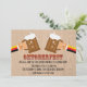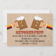Comece a comemoração do Oktoberfest com este convite com os braços de dois homens em um estilo de desenho animado e na cor da bandeira alemã, oferecendo um brinde com duas canecas de cerveja de cerveja gelada em um fundo de madeira.
