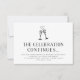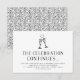 Mantenha a festa rolando! Convites de festa após casamento em preto e branco com "a celebração continua" em tipografia preta com os detalhes da sua festa abaixo, encimados por duas taças de champanhe ilustradas unidas por um coração. O verso dos cartões apresenta um padrão de videira e broto botânico em preto e branco combinando.