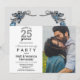 Celebre seu aniversário de casamento de prata com este convite de festa de aniversário de casamento de 25 anos Cheers to 25 years. Este design apresenta uma foto personalizável para inserir seu toque especial. O verso apresenta um fundo cinza suave, uma moldura prateada elegante e bonita com borboletas azuis. Personalize todos os detalhes da sua festa e altere a fonte ou a cor como desejar. Precisa de ajuda? Sem problemas. Basta entrar em contato conosco e ficaremos felizes em ajudá-lo a personalizar seu convite.