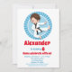 O convite de aniversário deste rapaz apresenta um garoto de artes marciais de cabelos bonitos com cinto preto. Sobre fundo decorativo azul.