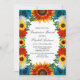 Design floral elegante e colorido para um evento de verão no quintal. Apresenta rosas azuis, margaridas brancas, flores silvestres vermelhas e girassóis