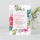 Este na moda e elegante convite para o chá de panela de Natal de inverno, brunch & bubble, apresenta um buquê floral de cor d'água em uma cor branca nítida. Uma mistura de flores de poinsettia, bagas ocas e folhas é colorida em tons festivos de vermelho, rosa, verde, pincel e azul com um roteiro manuscrito moderno. A parte de trás do convite é um vermelho colorido e rosado.