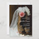 Convide os convidados para celebrar a recém-casada e o noivo na manhã após a cerimônia de casamento com o convite casual, porém elegante, Country Rose e Cowboy Boots para o Brunch de Pós-Casamento Western. Este convite personalizado relaxado e rústico com tema de rancho para o Café da Manhã ou Almoço Pós-Casamento apresenta uma fotografia charmososa em estilo de fazenda de botas de cowboy de couro marrom cheias de flores de rosa cor-de-rosa e um véu de noiva branco com um fundo de madeira de celeiro marrom desgastado pelo tempo. Inspiração perfeita para o seu evento de recepção de casamento informal em um celeiro.