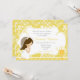 Este convite da Primeira Comunhão Damask apresenta uma adorável menina de cabelo marrom em um primeiro vestido de comunhão sagrado.