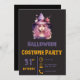 Escreva uma descrição do produto. Este é um Convite de Festa de Fantasia de Halloween (escreva uma descrição apenas do produto, não um convite). Este é um convite de Halloween super moderno. Tem um fundo preto. Usa laranja e roxo para todas as palavras. Usa ícones para tempo, localização e telefone para confirmar presença. Tem um gráfico simples no topo do convite de uma bruxa super fofa de cabelo rosa com um chapéu de bruxa roxo.