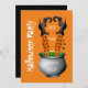 O convite engraçado e bonito do Halloween é perfeito para o seu Festa de Halloween com uma bruxa de cabeça para baixo numa caldeirinha. Cores temáticas em preto e laranja. Tema da bruxa bonita.