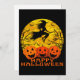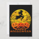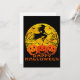 Feiticeira Feliz De Halloween Engraçada Na Vassoura Com Esta Bela Absorção De Abóbora Atrás Da Lua Amarela Com Morcegos Voadores E Árvores Silhuetas E Bruxa-Dama. Convide Seu Amigo Para A Festa De Halloween.