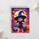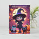 Este convite apresenta uma pequena bruxa com um vestido preto com gatos e abóboras na noite de Halloween.