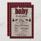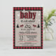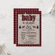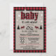 Búfalo vermelho super fofo e moderno verifica o passado com os charmosos rústicos, elementos do país de alce, pinheiros, uma cordilheira e fontes populares para seus convites para chuvas para bebês de um só tipo.