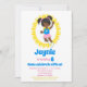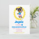 O convite para o aniversário desta garota mostra uma garota afro-americana gostosa Bunt House Jump, com roupas cor-de-rosa e azuis, meias e cabelos levantados em rabos de pele em um fundo branco de ponto amarelo.