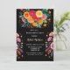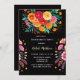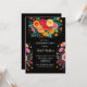 Uma ilustração vibrante e estilizada do buquê floral que apresenta uma mistura de flores coloridas em tons de rosa, laranja, amarelo e vermelho. As flores são dispostas em composição animada e caprichosa, amarradas com uma fita de cetim rosa. As estrelas ouros são aspergidas ao redor do buquê, adicionando um toque mágico. Diante de um dramático fundo negro, esta design é perfeita para convites para casamentos, papelaria romântica ou arte digital com tema de celebração.
