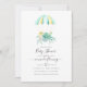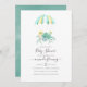 Ranunculus, tremoços, peões e suculentos, buquê de paraquedas neutro para o gênero, convite para chás de fraldas em tons pastéis com tipografia elegante para escrita manual.