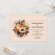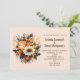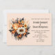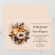 Um convite de casamento com um buquê de flores elegante e gótico. Composto por tulipas laranja, margaridas amarelas, folhas cinzas e raminhos e alguns acentos de bagas laranja.