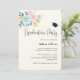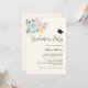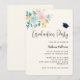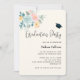 Convite de festa de formatura com ilustração em aquarela bonita. Um buquê de flores com flores rosa e azul cercado por folhas verdes e raminhos.