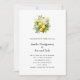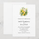 Convite de casamento com uma adorável ilustração de um buquê de limões rodeado por folhas de flores brancas e raminhos.