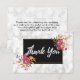 Um cartão de agradecimento de casamento com fundo de mármore branco. Sobreposto no topo há uma moldura preta com uma fina borda dourada. Os cantos são decorados com buquês de flores cor-de-rosa. Chique e elegante. O verso tem uma mensagem de agradecimento com o seu nome, que você pode personalizar ou remover.